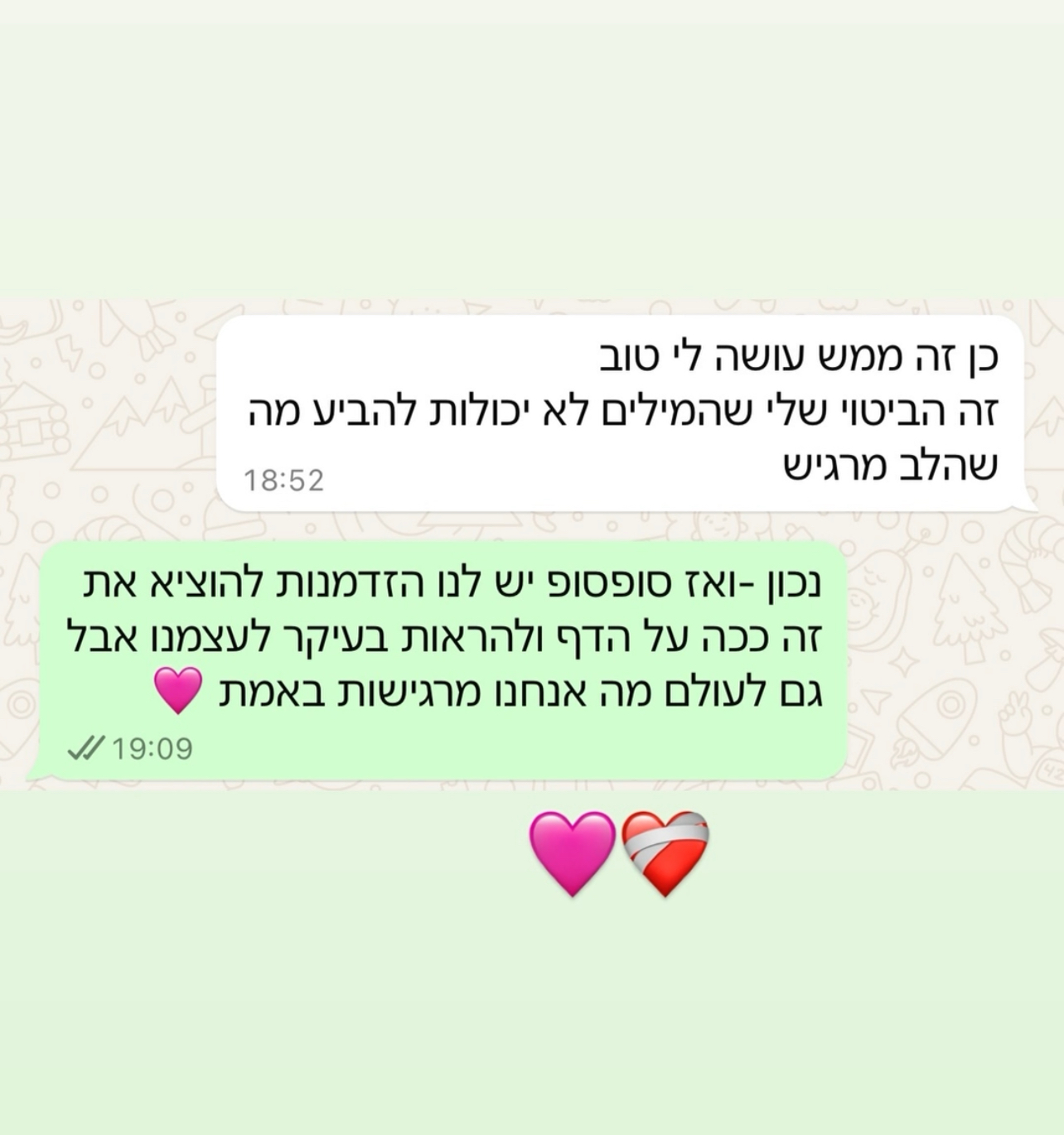 את יושבת מול המטפל, מנסה להסביר את הכאב העמוק שבוער בך, אבל המילים פשוט נתקעות בגרון.
